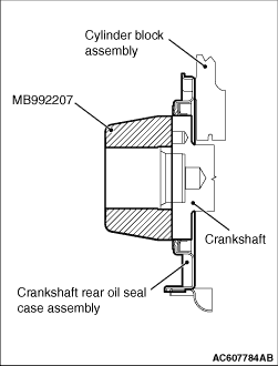 4.Install the special tool oil seal guide (MB992207) to the crankshaft rear oil seal case assembly in the opposite direction from the direction in step 3 (in the direction of the crankshaft rear oil seal case assembly installation).