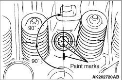 9.Give another 90° turn in the tightening direction to each bolt, making sure that the paint mark on the bolt head and that on the cylinder head are on the same line.