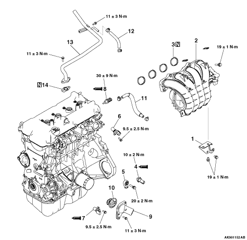 and the cylinder block, temporarily tighten the inlet manifold stay. 2.Check whether the sealing surface securely touch each other. 3.Tighten the bolts to the specified torque of 19 ± 1 N·m.