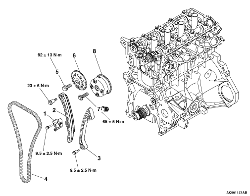 2.Install the timing chain tensioner onto the cylinder block, timing chain tensioner bolts