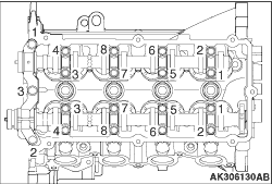 In accordance with the numerical order shown in the illustration, remove the front camshaft bearing cap first, and then remove the installation bolt of each camshaft bearing cap.