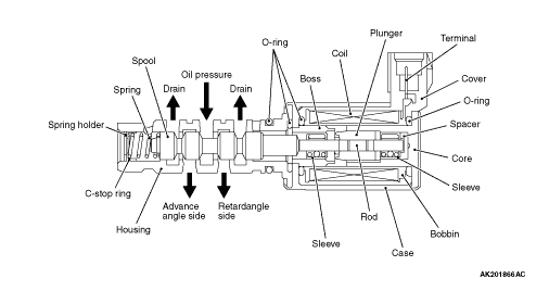 The OCV adopts the electromagnetic valve, which is driven by the signal from Engine-ECU, to switch the oil pressure which affects the vane rotor of the V.V.T. sprocket assembly.