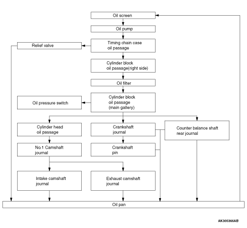 through the oil filter and to the cylinder block. From there, oil flow is divided into the passage