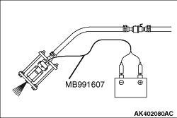 9.Connect the special tool Injector test harness (MB991607) between the injector and battery to drive the injector.