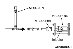 5.Mount the injector test set (MB992076) prepared with the special tool hose adapter (MB992001) onto the high-pressure fuel hose.