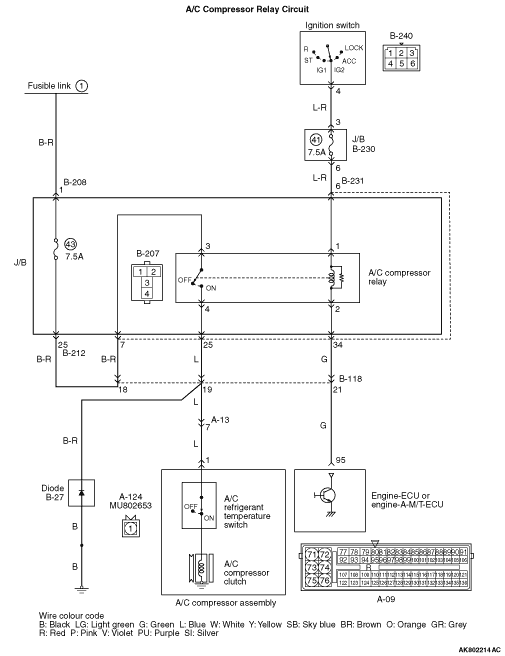 Check intermediate connectors B-231 and B-118, and repair if necessary. If intermediate connectors are normal, check and repair harness between B-207 (terminal No. 2) A/C compressor relay connector and A-09 (terminal No. 95) engine-ECU or engine-A-M/T-ECU connector.