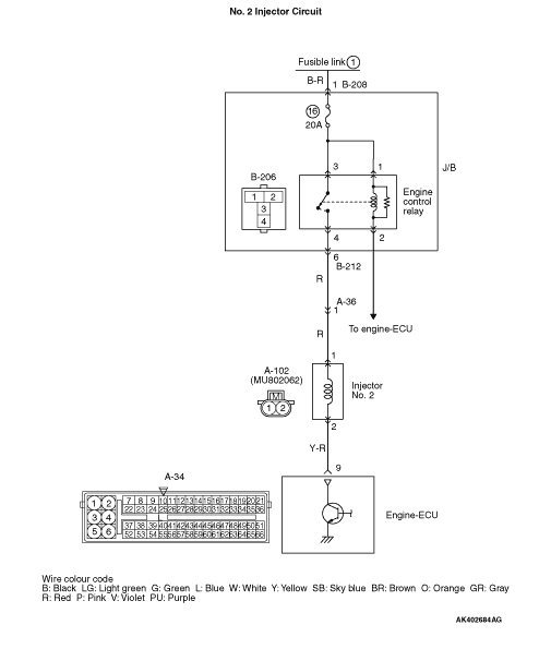 Check intermediate connector A-36 and B-212, and repair if necessary. If intermediate connector is normal, check and repair harness between B-206 (terminal No. 4) engine control relay connector and A-102 (terminal No. 1) No. 2 injector connector.