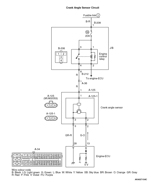 A-125 (terminal No. 1) crank angle sensor intermediate connector and B-206 (terminal No. 4)