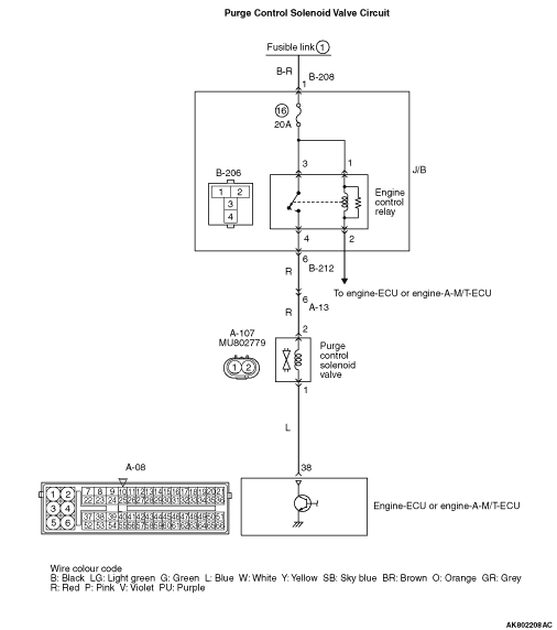 1) purge control solenoid valve connector and A-08 (terminal No. 38) engine-ECU connector or engine-A-M/T-ECU
