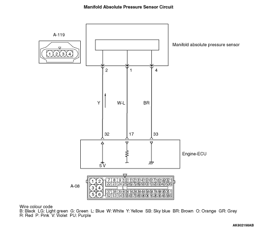 Check and repair harness between A-119 (terminal No. 2) manifold absolute pressure sensor connector and A-08 (terminal No. 32) engine-ECU connector.