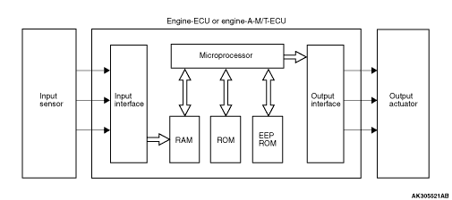 The engine-ECU or engine-A-M/T-ECU consists of a 32-bit microprocessor, random access memory (RAM), read only memory (ROM), and input-output (I/O interface).