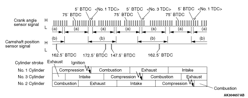 1. When a chipped tooth is detected through crank angle sensor signal, check whether the signals of the camshaft position sensor exist or not within the range of (a). If the signals exist, identify the cylinders. Unless the signals exist, do not identify the cylinder.