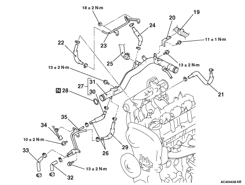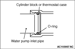 Fit the O-ring to the groove on the water inlet pipe. Apply water on the O-ring outer edge or the installation area of the water pump inlet pipe (inside the mating part), and then insert the pipe to the cylinder block or thermostat case assembly.