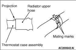 1.Insert radiator upper hose as far as the projection of the thermostat case assembly.