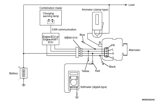 4.Use the special tool Alternator test harness (MB991519) to connect a digital voltmeter between the alternator "S" terminal and earth [Connect the (+) lead of the voltmeter to the "S" terminal, and then connect the (-) lead of the voltmeter to a secure earth or to the battery (-) terminal].