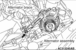 Loosen the bolt indicated by an arrow and move the alternator brace upward. Then lift