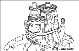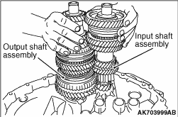 Pressing the input shaft assembly and the output shaft assembly at the same time, remove them as shown in the illustration.