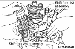 3.Slightly lifting the input shaft assembly and the output shaft assembly, install the shift fork 2/4 assembly and the shift fork 1/3 to the clutch housing.