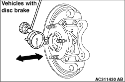 move the hub in the axial direction and check whether or not there is axial play. Limit: 0.05 mm 4.If the play exceeds the limit, replace the rear hub assembly. 5.For vehicles with disc brake, after having checked, install the brake disc, the caliper
