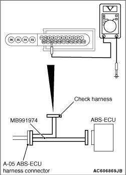 (1)Disconnect the ABS-ECU connector, connect special tool ABS check harness (MB991951)