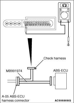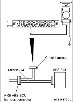 (1)Disconnect the ABS-ECU connector, connect special tool ABS check harness (MB991951)