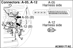 STEP 11. Connector check: A-05 ABS-ECU connector, A-12 front wheel