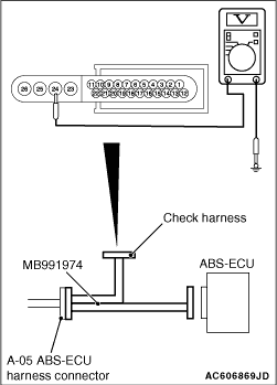 (1)Disconnect the ABS-ECU connector, connect special tool ABS check harness (MB991951) to the harness-side connector, and then measure the voltage at the special tool connector side.
