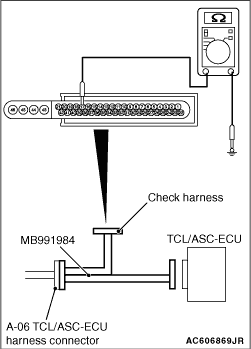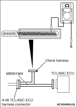 (1)Disconnect the TCL/ASC-ECU connector, connect special tool ABS check harness (MB991984) to the harness-side connector, and then measure the resistance at the special tool connector side.