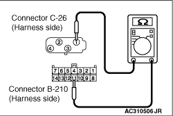 (2)Measure the resistance at the C-26 G and yaw rate sensor connector terminal No.1 and B-210