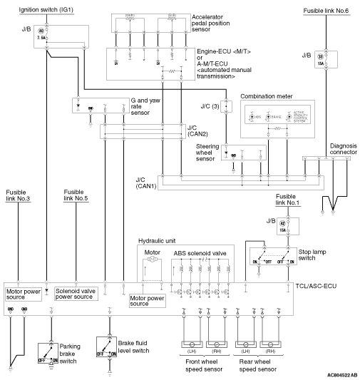 Used as the brake warning lamp for the parking brake, brake fluid level, and EBD control. Informs the driver of the system status by illuminating or turning off the brake warning lamp according to the signal from TCL/ASC-ECU.