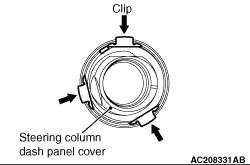 1.Remove the 3 clips (shown in the figure) from inside of the vehicle and drop the steering column dash panel cover through the body panel.