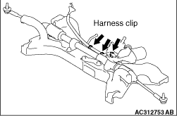 After installing the steering gear and linkage assembly to the front axle No.1 crossmember, secure the 3 harness clips of the steering gear and linkage assembly to the front axle No.1 crossmember.