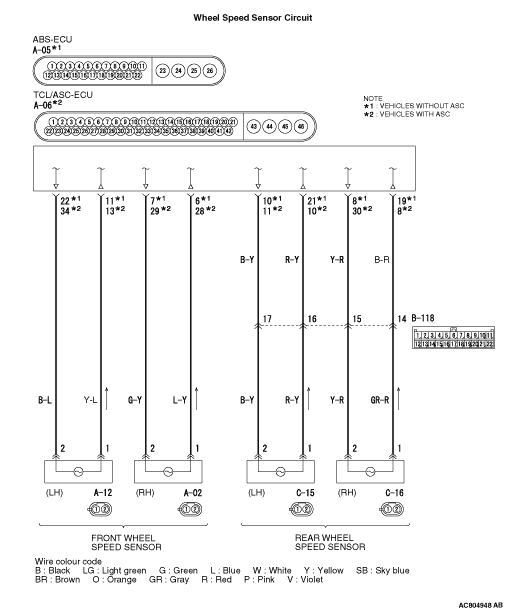• Defective wire(s) or connector(s) in the wiring harness between the TCL/ASC-ECU and the wheel speed sensor