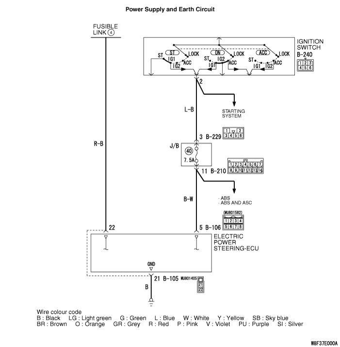 • The harness wire between electric power steering-ECU connector B106 and ignition switch (IG1) B-240