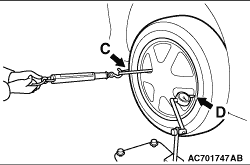 • In case of use of spring balance, pull alternately position C and D of the wheel rim (front side and back side), where the position is the same height as the wheel centre, by spring balance with force 100N that is hooked to the wheel via a string, and the read scale of dial gauge as shown in the figure.
