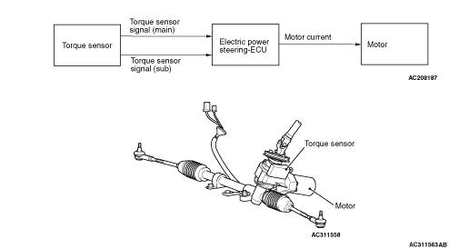 1. When the steering wheel is operated, the torque sensor integrated into the gear box detects the steering torque and outputs the torque sensor signal (main and sub), which varies with the steering force, to the electric power steering-ECU.