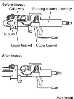 When the load of the driver’s body is applied to the steering wheel after airbag deployment, the steering column assembly moves forward and down along the tilt bush and guideway while sliding into the upper and lower brackets, absorbing an impact load.