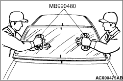 8.Bond the windshield to the body, and install the roof drip moulding quickly before the adhesive cures (Refer to GROUP51, Moulding ).