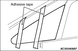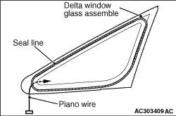(1) To remove the adhesive from the bottom of the delta window glass, feed a piano wire into the passenger compartment through the hole, and then cut off the adhesive seal line by pulling the piano wire alternately from the inside and outside of the vehicle.