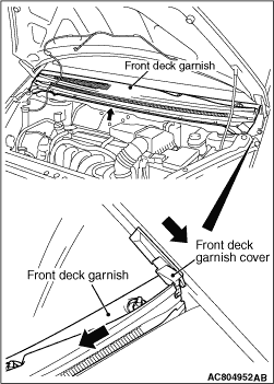 3.Lift the front deck garnish at centre and slide it to a direction opposite against a removing front deck garnish cover. By doing this, the claw of the front deck garnish cover is disconnected from the front deck garnish. 4.Close the hood. 5.Remove the clip at the front end of the front deck garnish cover. Slide the cover forward and remove it.