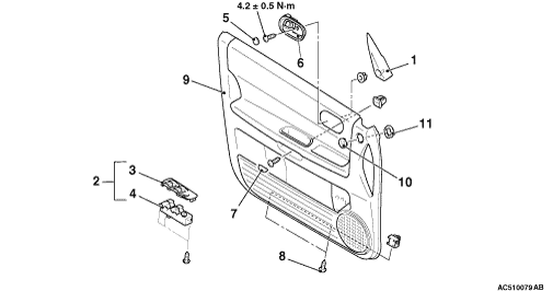>>B<< ESCUTCHEON, REGULATOR HANDLE AND CLIP INSTALLATION <VEHICLES WITHOUT REAR POWER WINDOW>