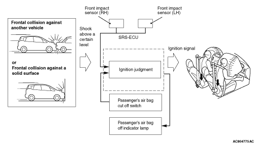 In case of a frontal collision, if the front impact sensor inside the engine compartment, the analogue G-sensor in the SRS-ECU and the front air bag safing sensor simultaneously detect an impact that exceed a certain criterion (turn ON), the SRS-ECU sends an ignition signal to the air bag modules (squibs) and seat belt pre-tensioners (squibs) on the driver and passenger sides, thus inflating the air bags and operating the seat belt pre-tensioners. Alternatively, when the passenger’s air bag cut off switch is set to the air bag off position, the SRS-ECU illuminates the passenger’s air bag off indicator lamp by disabling the deployment of passenger’s (front) air bag.