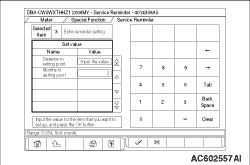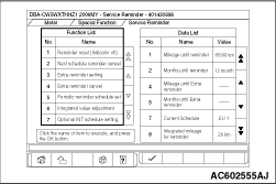 • If the combination meter needs to be replaced, the current driving distance and elapsed days must be entered into the meter after the replacement in order to be used for service reminder function. Therefore, read "Integrated mileage for reminder," "Integrated days for reminder," "Mileage until Extra reminder," "Months until Extra reminder," and "Current schedule" from the meter before the replacement using the special function of M.U.T.-III, and note them. If "Integrated mileage for reminder" or "Integrated days for reminder" cannot be read from the meter using M.U.T.-III, use the following method.