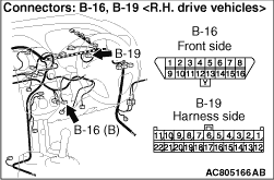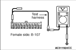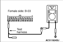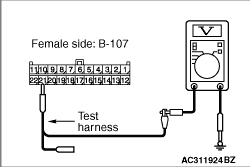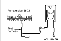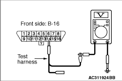 (1)Disconnect the connector, and measure at its female-side intermediate connector (at the front wiring harness side). (2)Connect the negative battery terminal, and turn the ignition switch to the ON position.