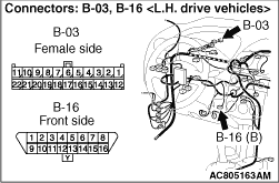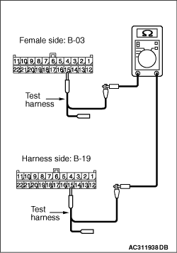 (1)Disconnect the connector, and measure at its male-side intermediate connector (at the instrument panel wiring harness side). (2)Ignition switch: OFF (LOCK) (3)