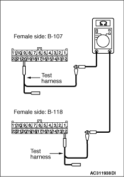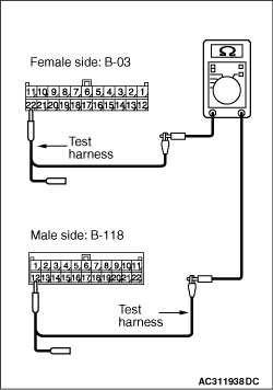 (1)Disconnect the connector, and measure at its female-side intermediate connector (at the front wiring harness side). (2)Ignition switch: OFF (LOCK) (3)