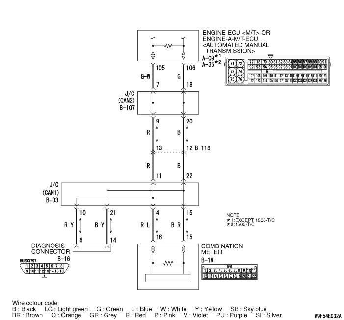 (4)Continuity between B-107 joint connector (CAN2) terminal No.7 and A-09 engine-ECU <M/T> or engine-A-M/T-ECU <Automated manual transmission> connector terminal No.105 <except 1500-T/C> OK: 2 Ω or less
