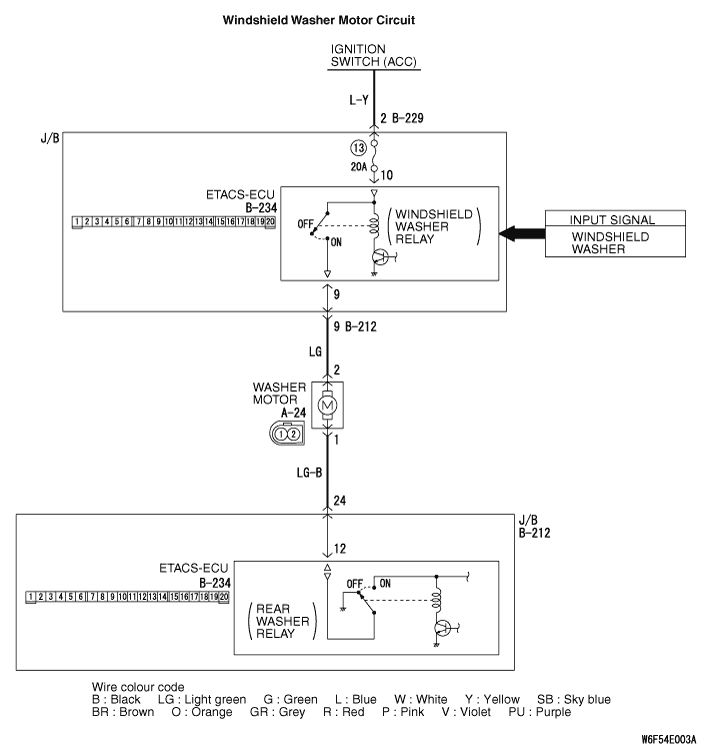 The washer motor, the column switch or the ETACS-ECU may be defective.