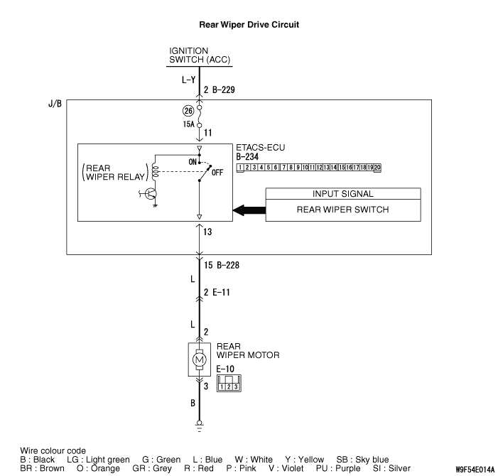 If the rear wiper does not work normally, the input signal circuits to the components below, the rear wiper motor or the ETACS-ECU may be defective.