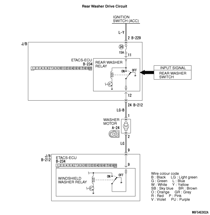If the rear washer does not work normally, the input signal circuits to the washer switch, washer motor or the ETACS-ECU may be defective.